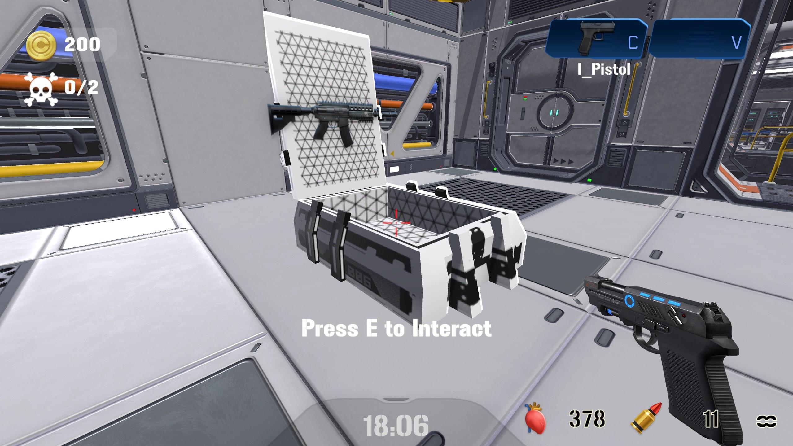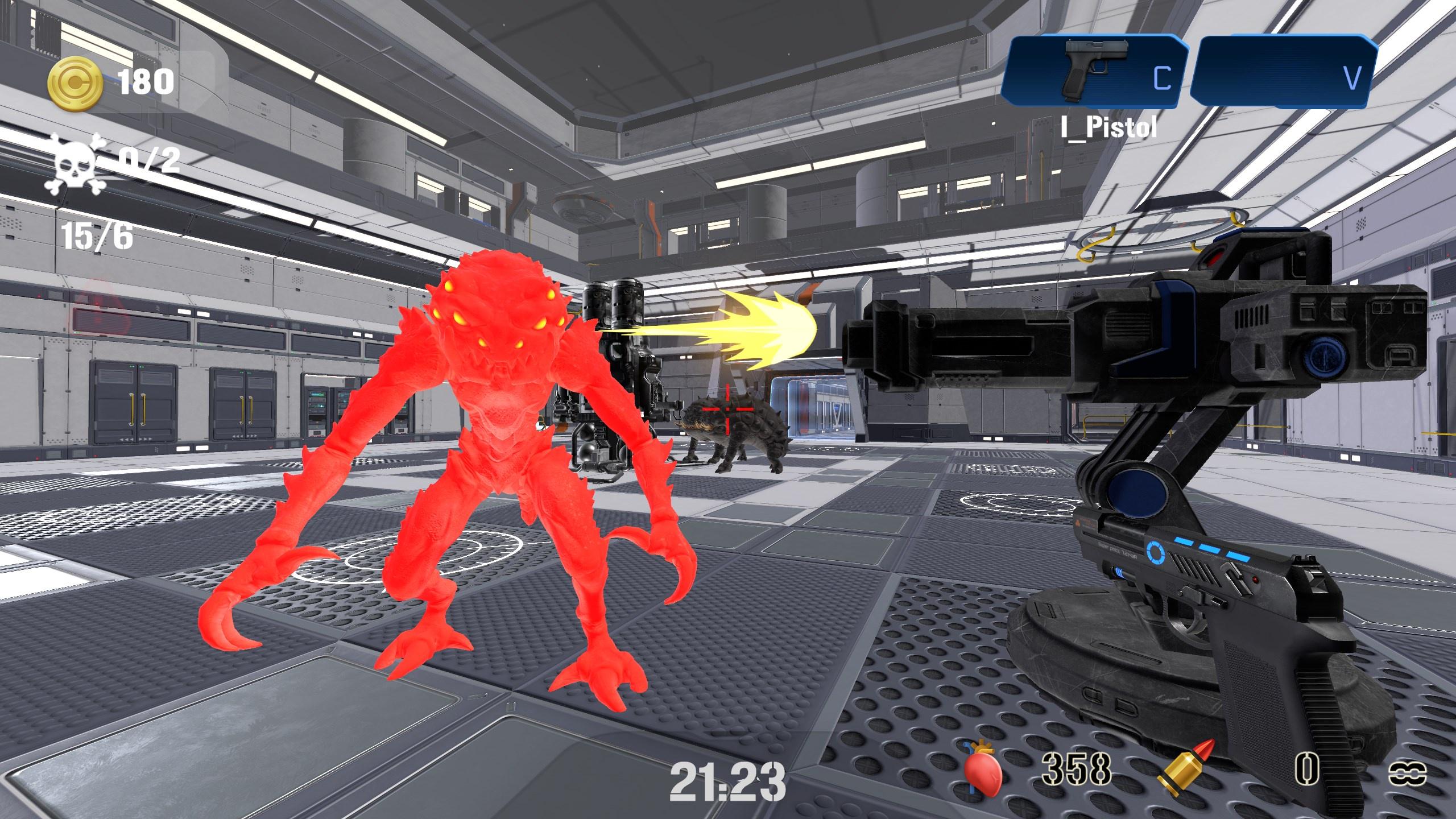 To escape this slowly explosive station, the player has to find and encounter all the bosses to get keys. Player can buy and equip turrets, which shoots nearby enemies in a certain range to protect the oxygen container while they are on the way to defeat bosses.